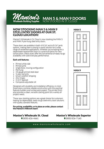 Manion’s Wholesale in St. Cloud is now stocking the MAN 5 and MAN 9 pre-hung steel entry doors (pictured below).